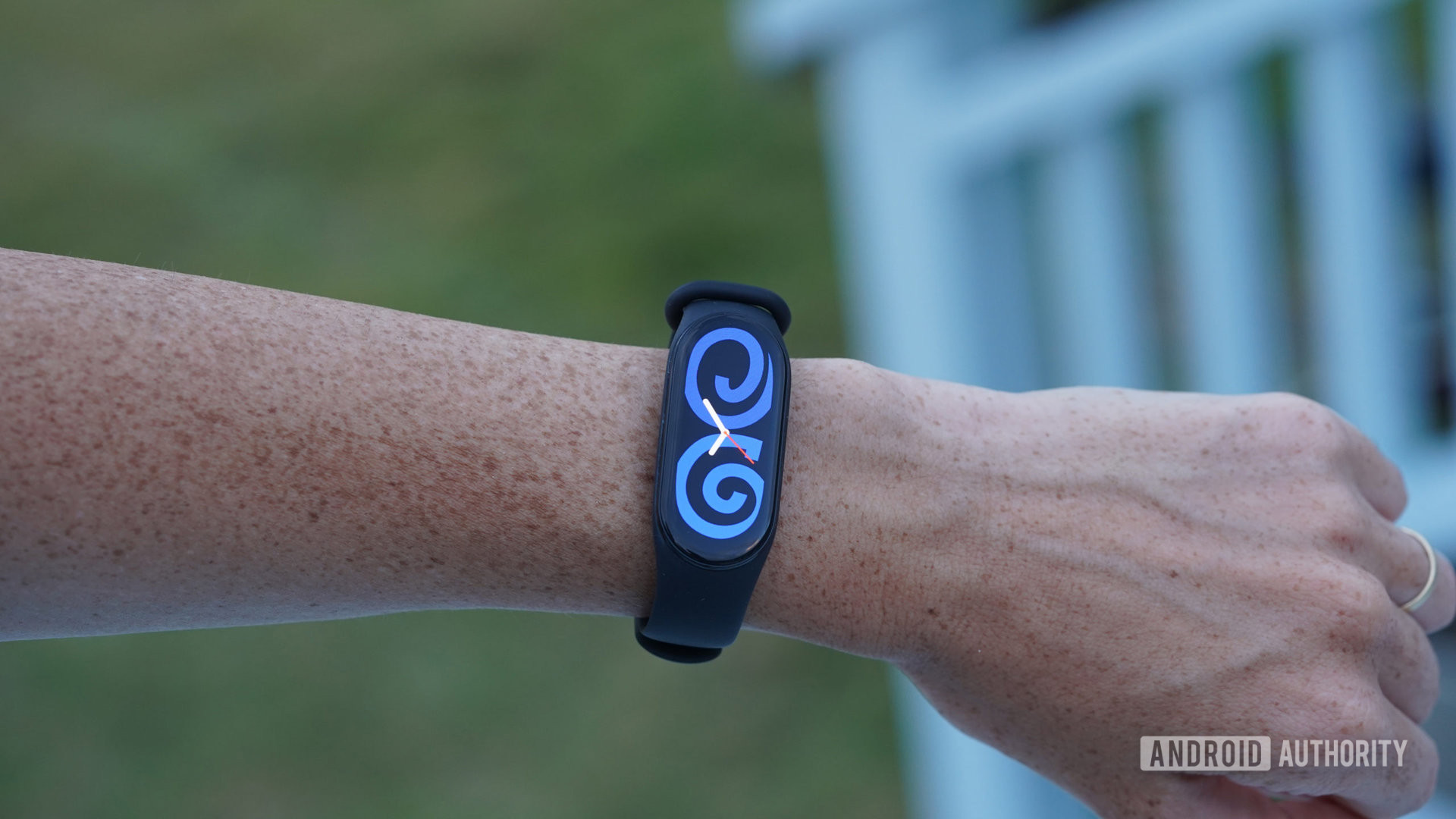 A Xiaomi Mi Band 7 displays its watch face.