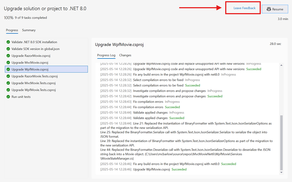 Start your upgrade journey today with GitHub Copilot app modernization – Upgrade for .NET! Your feedback is crucial to us as we aim to improve the product during this public preview. To share feedback with the team, please utilize the “Leave Feedback” button in the upper right corner of the Upgrade Manager UX in Visual Studio.