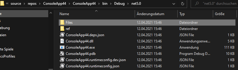 As you can see both files are in the subdirectory Files, and no text file is in the root folder, since the file in the root folder isn’t marked as <CopyToOutputDirectory>PreserveNewest</CopyToOutputDirectory> but the link is.
