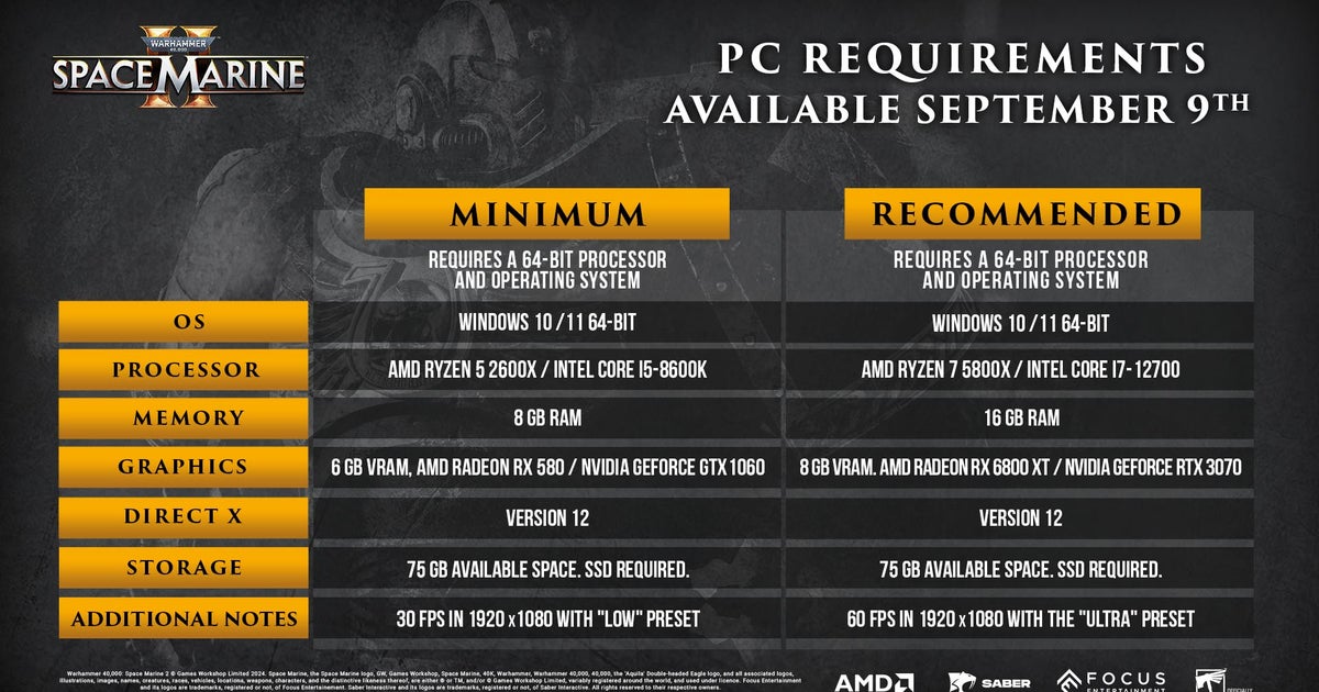 All of which is to say that Focus Home have released the system requirements for huge-shouldered action game Warhammer 40,000: Space Marine 2. Find them proudly emblazoned across the header image above, and written out for easier copy-pasting in the blockquote, below.