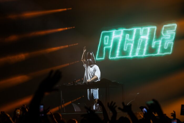 DJ Pickle dons a distinctive mask that complements his name as he performs as the opening act for Steve Aoki at The Armory in Minneapolis.