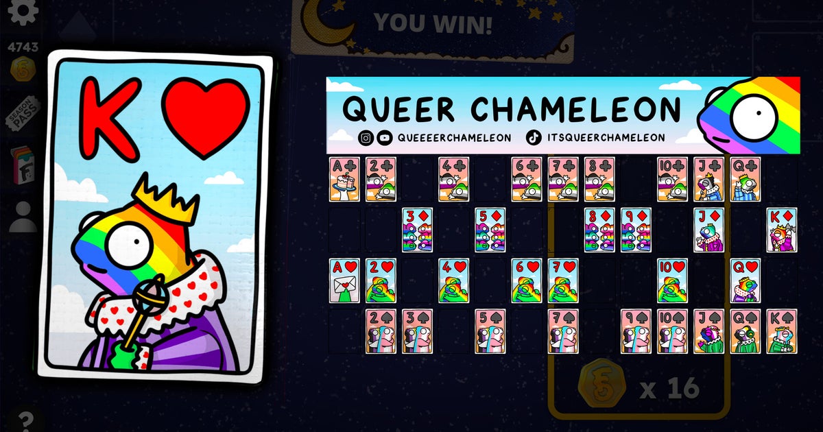All that’s from the latest edition of Video Games Industry Memo, written by George E. Osborn. To start from the beginning, Flick Solitaire released on iOS and Android in June 2020. It’s a free-to-play collection of Solitaire variations distinguished by the titular flick controls and some lavish decks from independent artists, which include cards with queer themes such as Amee Wilsons’ Queer Chameleon Deck (pictured above) and Ollie T’s Drag Deck. I can’t say I’m compelled by the familiar option to grind for unlockable decks, or spend real money on in-game coins or a subscription pass, but I do think some of the designs are beautiful.
