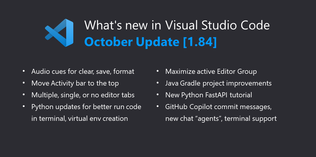 Welcome to the October 2023 release of Visual Studio Code. There are many updates in this version that we hope you’ll like, some of the key highlights include: