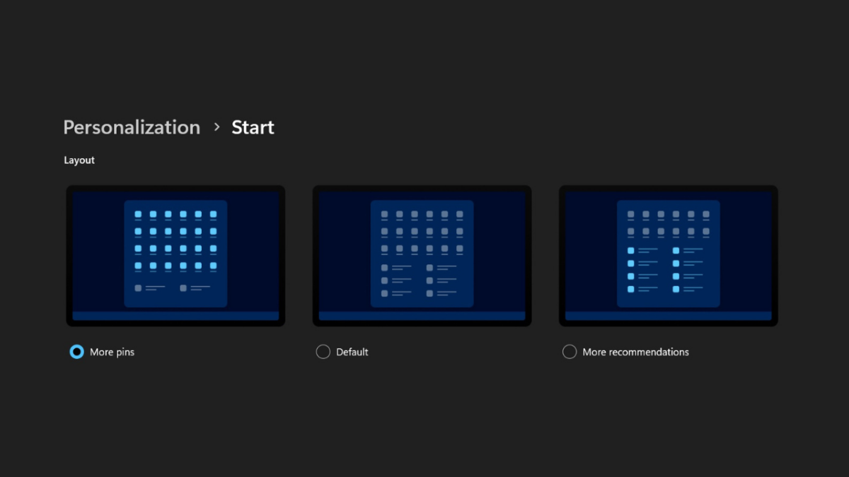 Windows 11 provides users with three layout options for the Start menu: More Pins, Default, and More Recommendations.